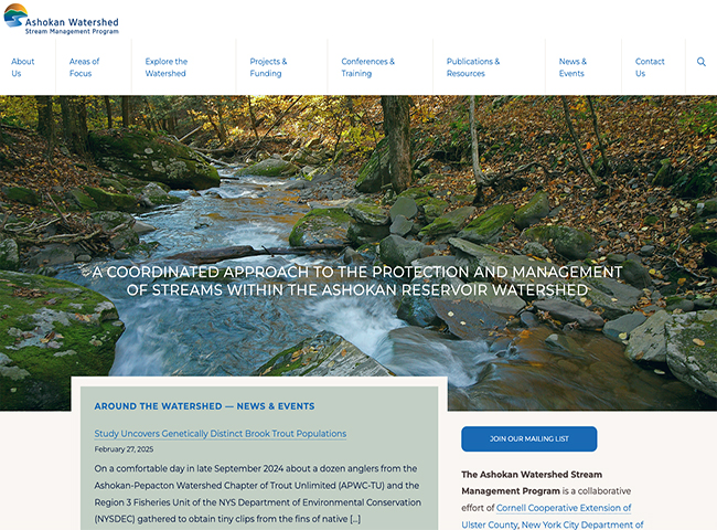 The Ashokan Watershed Stream Management Plan, a joint effort by Cornell University and the NYC Department of Environmental Protection, works to preserve and enhance water quality. Visit the site at ashokanstreams.org.